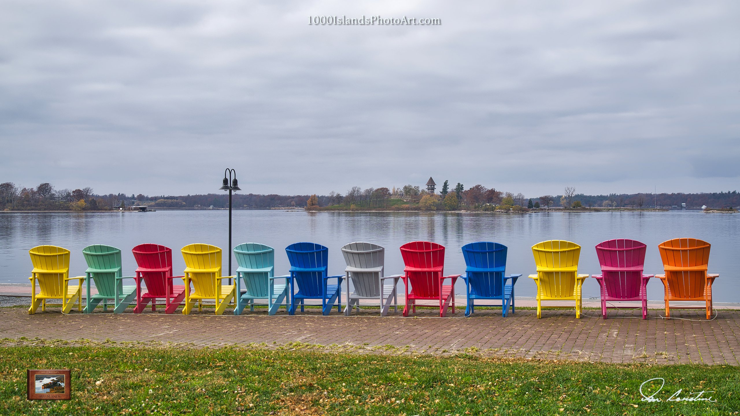 Along the way, John Durand of Wellesley Island Building Supply began offering the books. When we first met, he shared with me that since the first book had been released, increasing numbers of customers had come to his store for these colors. Before long, pastel chairs began popping up all over the place, even far beyond the River, eventually offered in resin like these which so beautifully compliment Clayton’s waterfront.